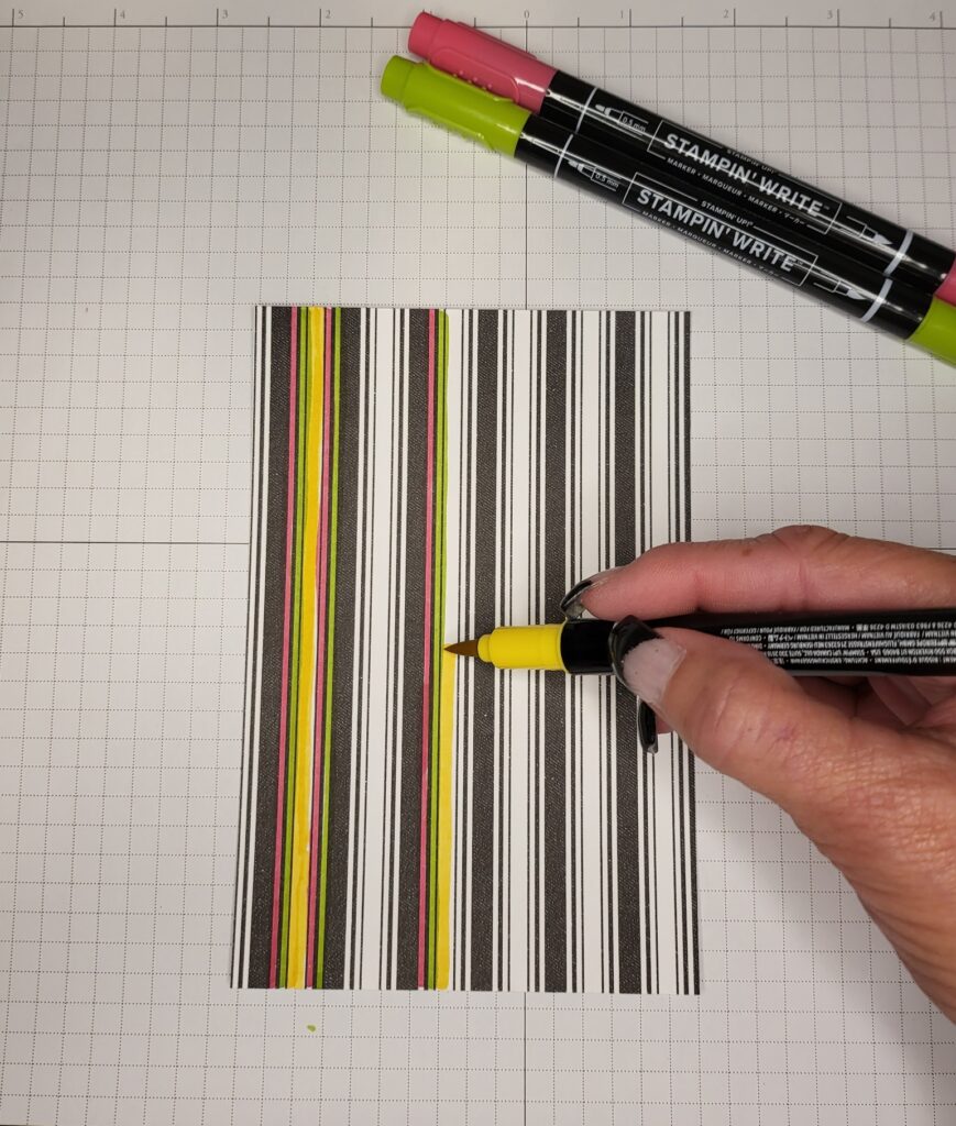 The next DSP is the black & white stripes. I used the Stampin Write Markers. With the markers you get one shade of color. The Stampin Write Markers are very similar to the Stampin Blend markers. The only difference is the Stampin Write Markers are water based & the Stampin Blends are alcohol based.